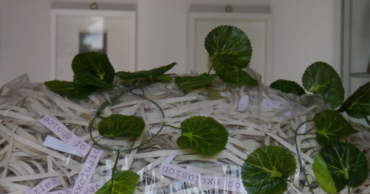 The piece featured shredded paper printed with evocative words and phrases — from prescribed medication to manic elation, from illicit drugs to depression. Each strip symbolised fragments of identity and experience, interwoven within the complexity of the disorder.