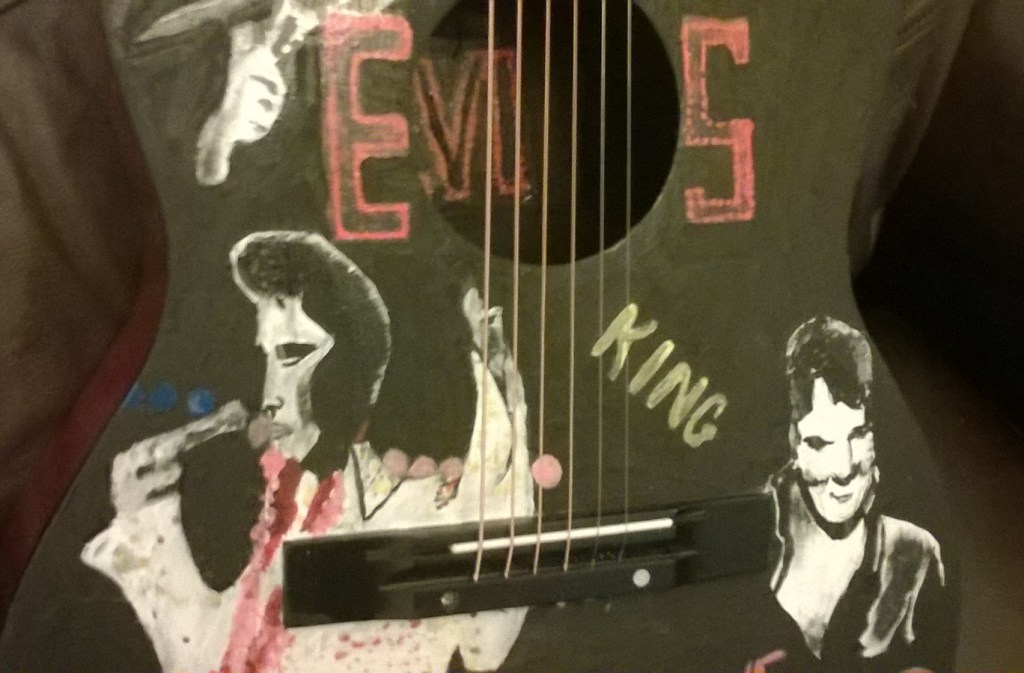 We have a love song being performed, the unforgettable white sequin jumpsuit introducing rhythm. The loveable smile and we are ‘ALL SHOOK UP’ by the lyrics. ‘Elvis’ in lights crosses into the inners of the string instrument. The ‘King’ is proclaimed and finished off with the Hollywood Star.