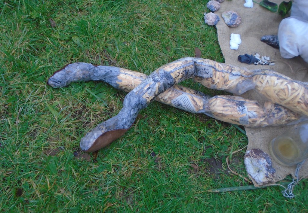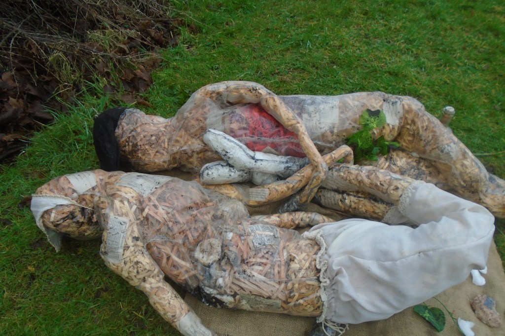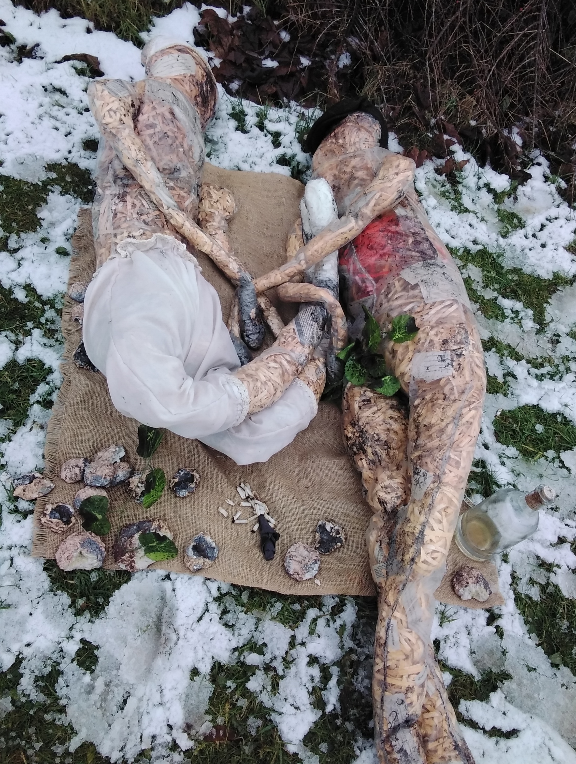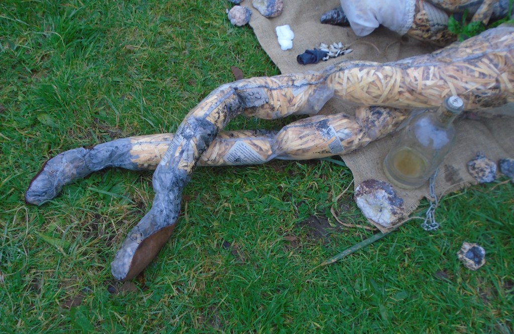 Walking on foot for a prolonged distance is implied by  uncomplicated shoe soles to the outer surfaces of the man’s feet. To be sufficiently degraded to push the concept of ‘Worn thin’ to the extreme. Women were often barefoot, her shoe soles not present. Hunger is simulated by the inclusion of modelled blighted Irish lumber potatoes. Created from potato clay, this is actually produced from flour and cornstarch but named potato clay due to it’s mash-like qualities in production. Acrylic paints  reinforce the idea of blight through white areas. The potatoes to be situated around the wife’s breast to identify with the female form. Fake foliage leaves  with black speckles are to reflect the toxins of the times. Leaves are prominent  around the groin, giving an indication of public hair and unquestionably the human form. The female form to display a kerchief, the male a cloth peak cap, both to be well worn.