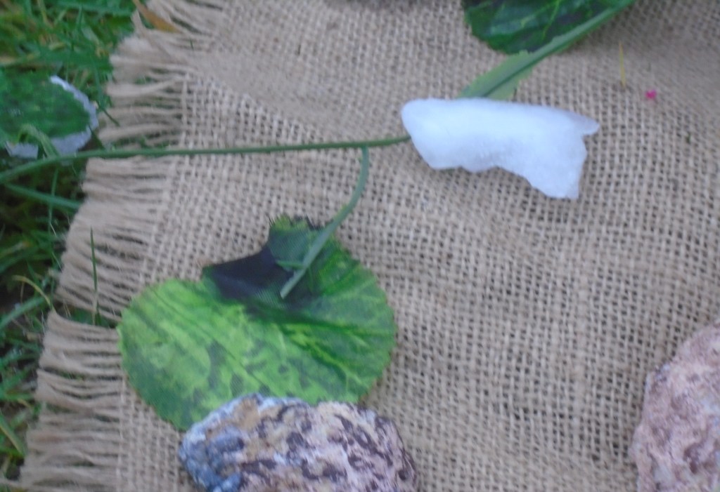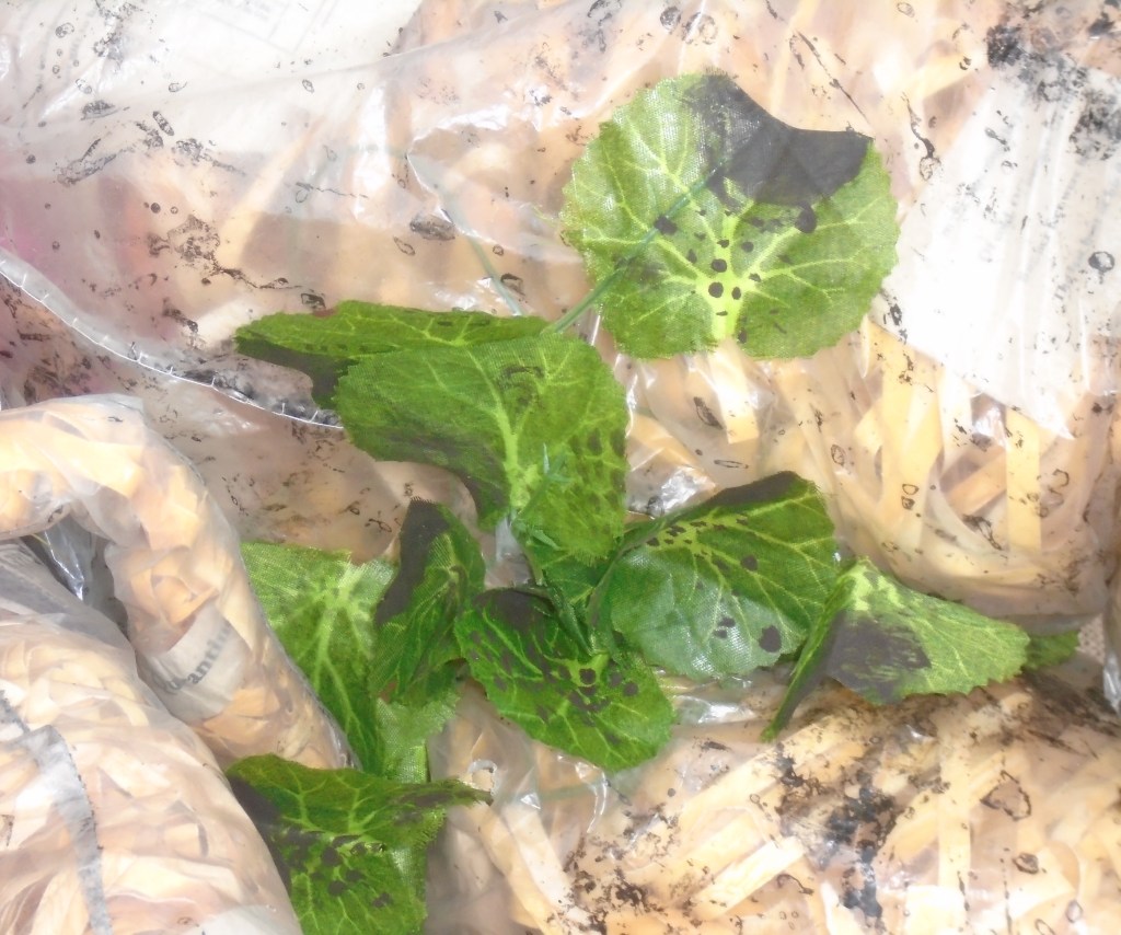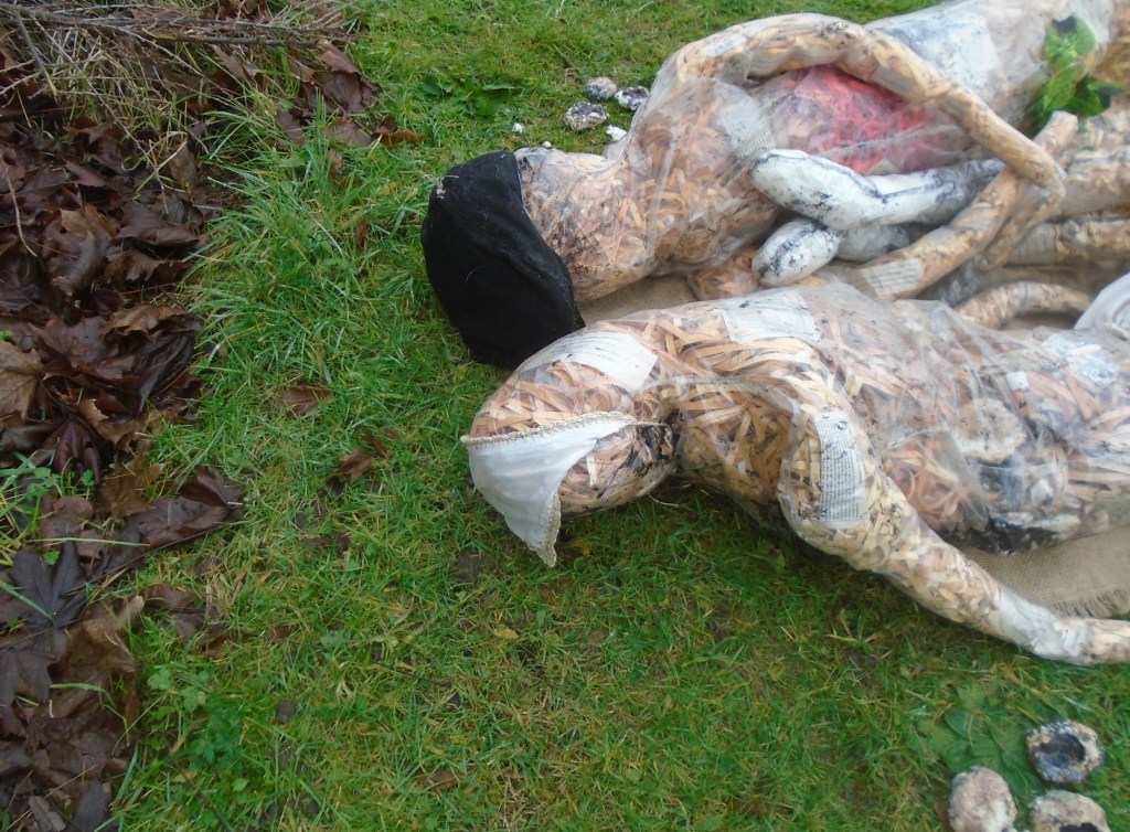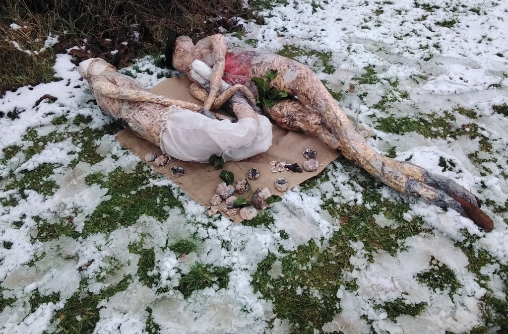 Walking on foot for a prolonged distance is implied by  uncomplicated shoe soles to the outer surfaces of the man’s feet. To be sufficiently degraded to push the concept of ‘Worn thin’ to the extreme. Women were often barefoot, her shoe soles not present. Hunger is simulated by the inclusion of modelled blighted Irish lumber potatoes. Created from potato clay, this is actually produced from flour and cornstarch but named potato clay due to it’s mash-like qualities in production. Acrylic paints  reinforce the idea of blight through white areas. The potatoes to be situated around the wife’s breast to identify with the female form. Fake foliage leaves  with black speckles are to reflect the toxins of the times. Leaves are prominent  around the groin, giving an indication of public hair and unquestionably the human form. The female form to display a kerchief, the male a cloth peak cap, both to be well worn.