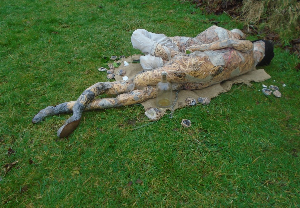 The figures are positioned on a floor based sack cloth, woven and tattered. This will form the impression of being exposed to the elements, lying the sack cloth  down as a blanket to protect from ground frost. Stones to be added within the figures and to transient the exhibits to indicate rough sleeping.