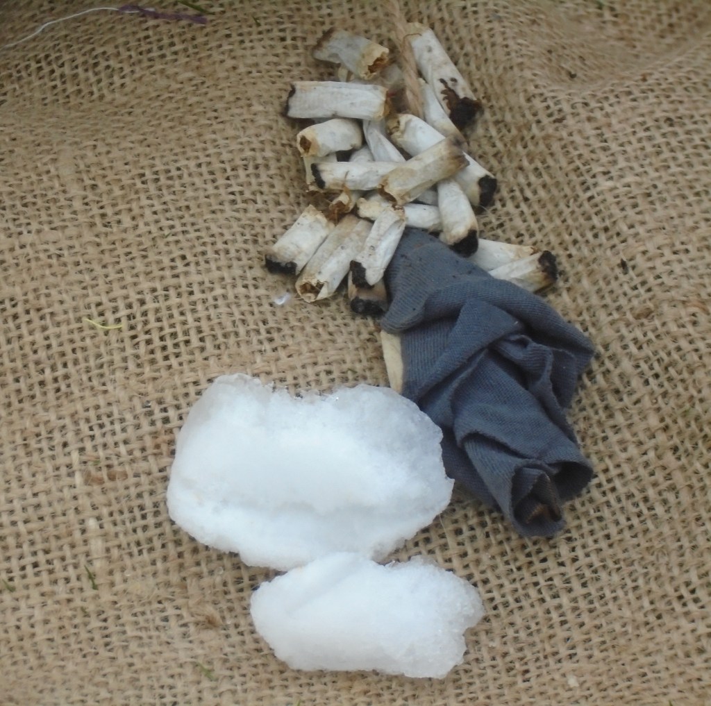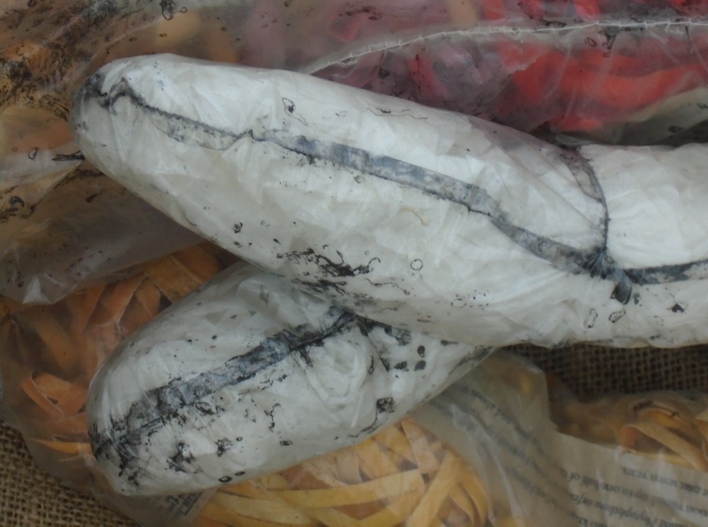 ‘Worst’ is repetitive throughout the poem, highlighting the disparengies of the late 1840’s. Black acrylic paint was applied using flicking techniques across the inner of the polythene to represent the anguish and distress the couple endured and 1847 being titled ‘Black 47’, the worst year of the famine. The leaving of the workhouse to be determined by printed replicas of discharge papers and statements included within the forms. Newspaper articles of the period relating to the hardships and failing crops align the bodies further. Raggard clothing is prominent, showing how workhouse conditions often meant that clothing was often re-used from those who have died from fever and dysentry without being laundered. The roll up buts draw attention to how the smoking of tobacco was commonplace among the poor and labouring class during the Victorian era. This leads to tooth decay, studies show that up to 80% of famine victims suffered from poor oral health. The empty bottle of whiskey is equally familiar, the Irish took the drink to the United States through the period of mass emigration due to the famine. A rural location is suggested through the chain and shackle, habitual within farming communities.