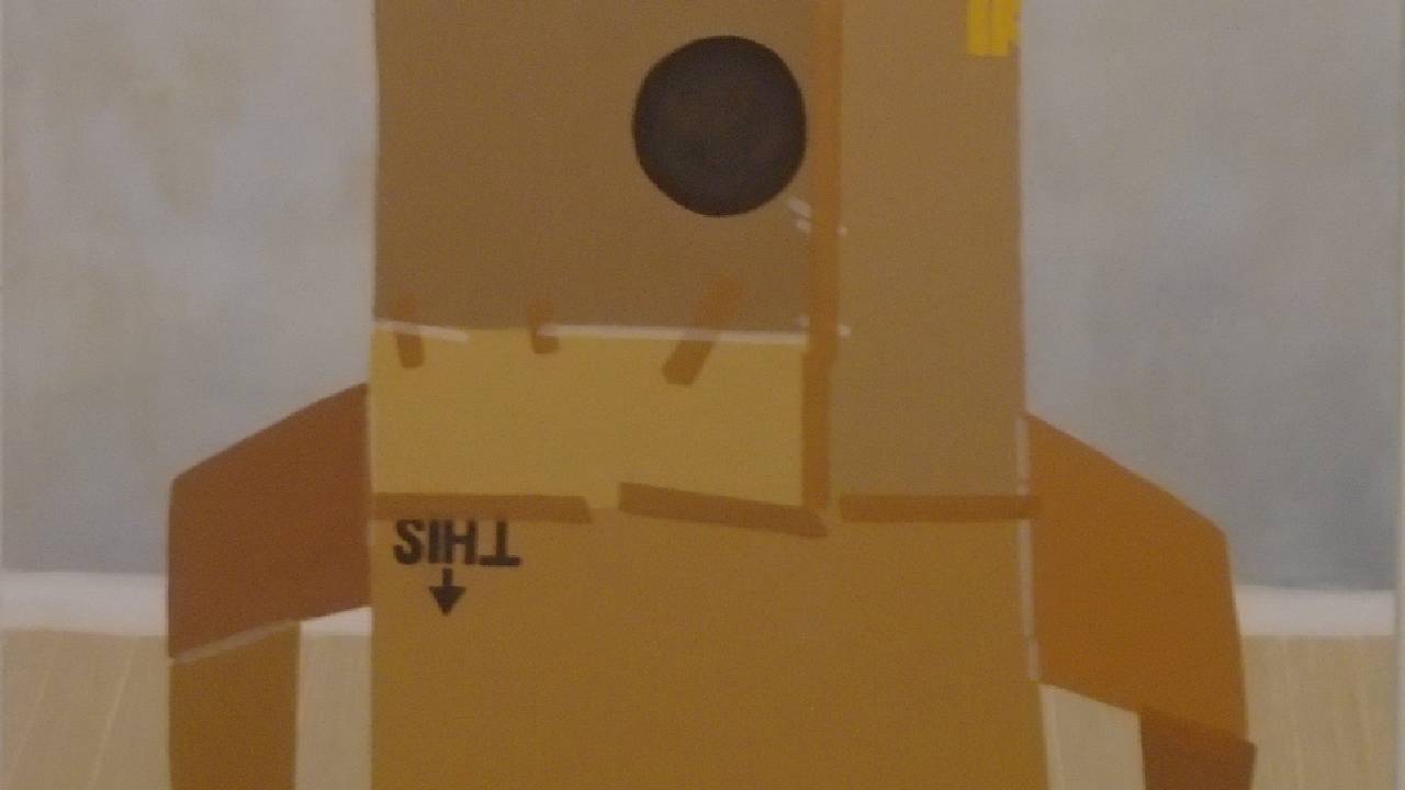 ‘To the Moon and Back’ impact appears even more significant as a response to lockdown. Painted pre-pandemic, on first glance appears to be a representation of a lock-down, home schooling project. Arrows pointing in the wrong direction, weight indicators and ‘Fragile’ markings take up surface space on this corrugated cardboard spaceship. Glorious in its lack of symmetry, sublimely tacked together with odd lengths of teeth cut brown tape. The scholastic creation engulfs the interior, standing just short of the light fitting. Most significantly, Fleur Yearsley has captured the desire to escape and break free from the isolation of the home.