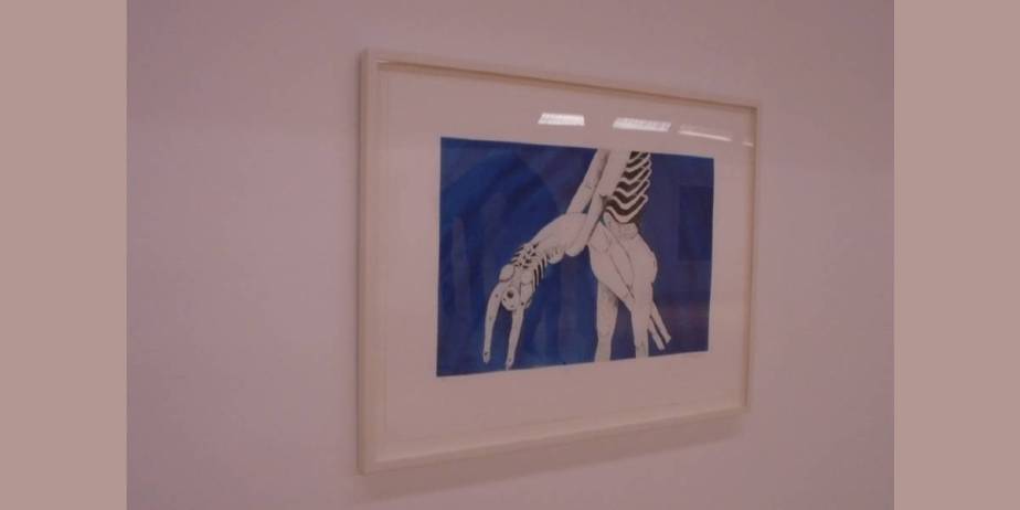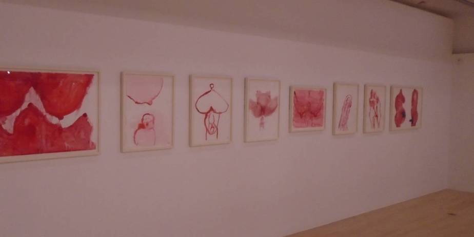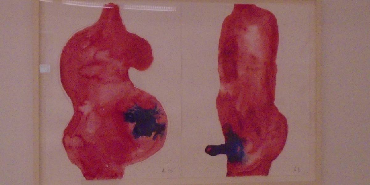 Couple 2007, shows Bourgeois returning to themes of motherhood, fertility and copulation which she explores throughout her 70 year span as an artist. Struggling with fertility personally, Bourgeois’ eldest son was adopted as she had been advised she was unable to conceive. Subsequent to the adoption, she gave birth to two further sons without medical intervention. A leading figure within the Fight Censorship Group, founded in the seventies as a response to local authority threats to close a show: ‘The Sexual Politics of Feminist Art’. Throughout her work Bourgeois flaunted the image of an erect penis, Couple 2007 a prominent architype. Per contra, the image is dominated by the female form, the overblown scale of her impregnated womb and doctored bosom. Use of reds are frequent within the period produced, when she was mature in years and beyond the time of fertility. The use of gouache, wet on wet, forms natural, unrestricted marks. Bourgeois early career portrayal of genitalia paved the way for feminist artist such as Judy Chicago. Positioned in a row of similar works from her later period, the wall space of the arts complementing the success of the floor based creations.