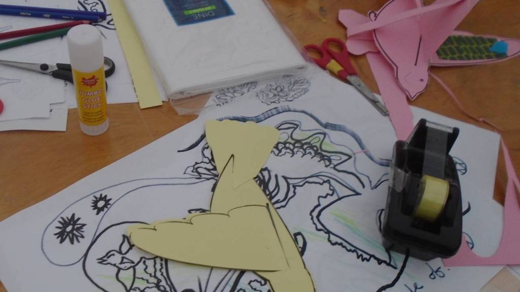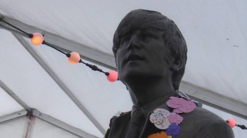 The celebrations then moved to the marquee sited in the quadrangle in the rear of the library. This gave the children a chance to shine, flapping bird creations in the formation. Mid afternoon all actions were to cease. As ‘Imagine all the people’ took over the sound waves, John Lennon made an appearance. On what would have been the Beatles legends 81st Birthday, he literally got off his trolley. An oversized bronze statue of Lennon was wheeled into the marquee, then resting centrally. Smart phones on hand, the crowds endeavoured to capture images of the immortalised icon of Beatlemania. Adorning a paper chain of corsages, the aloofness of the sculptural representation was apparent as he stared, off-focus, into the endless heavens.