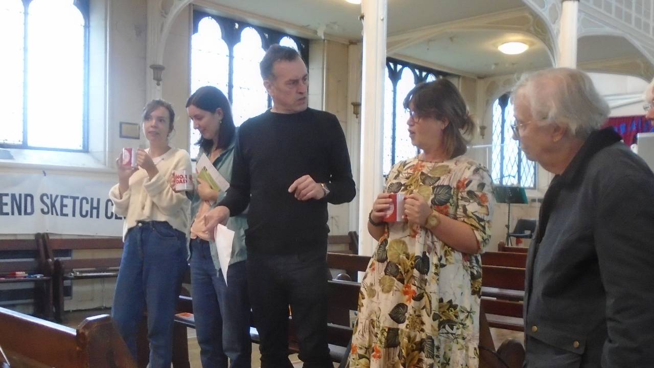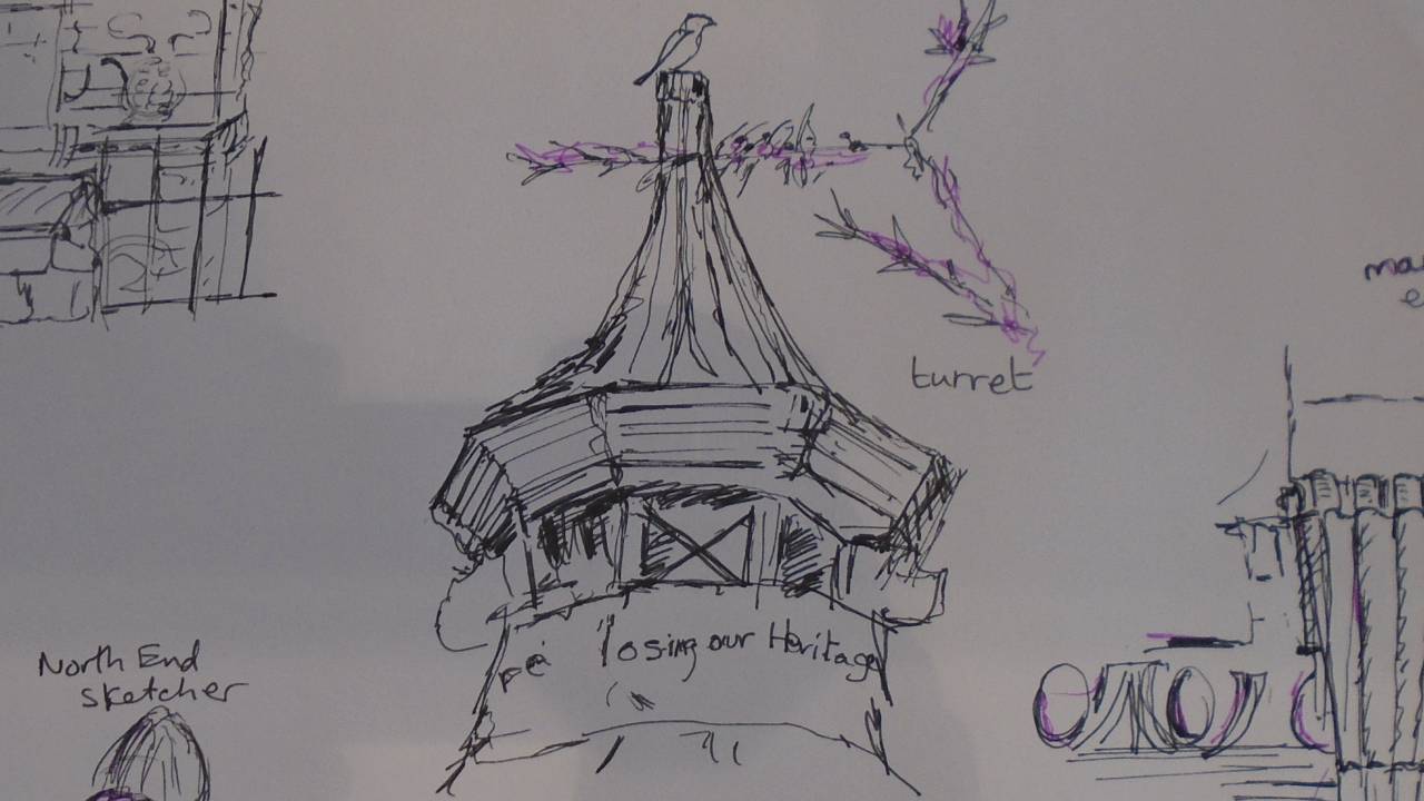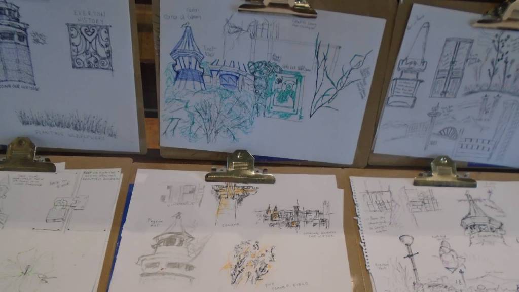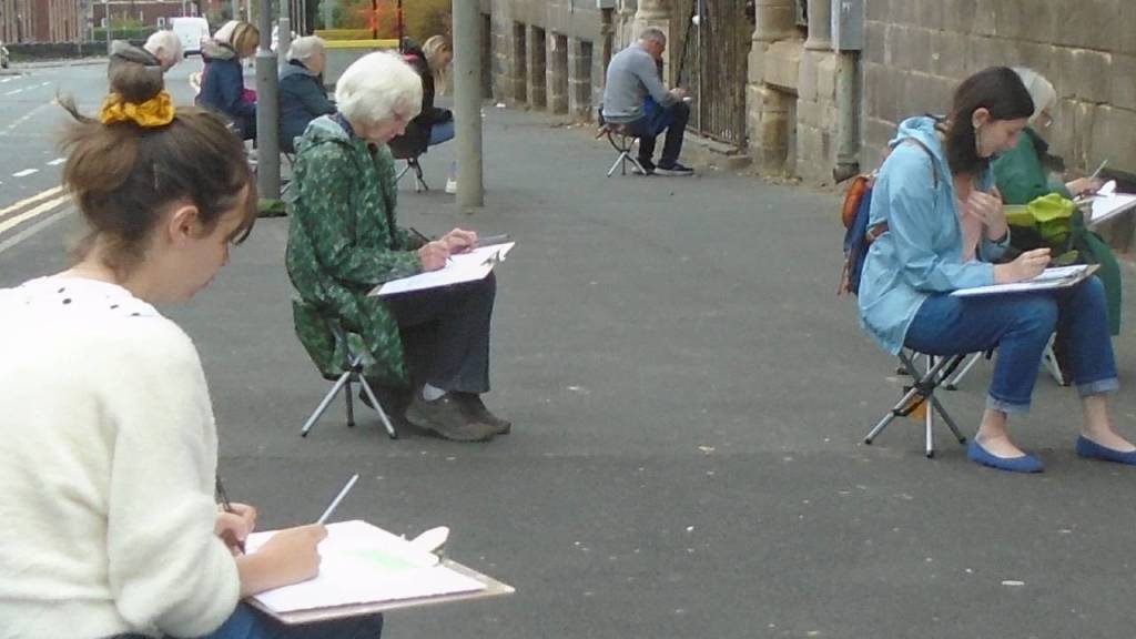 The day started with a divide, a creative one in this case. Gathered in the historic St George’s Church, opposite the Birthday Building, two camps were formed: the artists and the writers. North End sketchers made up the majority of the drawers. They picked up their stools, papers, clip boards, trusted pencils and made haste to visually document the once great Victorian structure. The writers were briefed to consider the past, present and the future of the grade II listed home of learning. Biros to lined jotters, some wrote of memories of when the library had functioned, others identified with its current state of disrepair. The two bodies were then to reunite, the urbanscapes were viewed and readings were prevalent. A first rate start to a creative celebration.