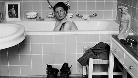 When World War II erupted, Miller transformed once again—this time into a fearless war photographer and correspondent for Vogue. She captured harrowing images of bombed-out London, front-line soldiers, and the liberation of concentration camps. One of her most famous photographs shows her defiantly bathing in Hitler’s Munich apartment, a striking act of resistance.