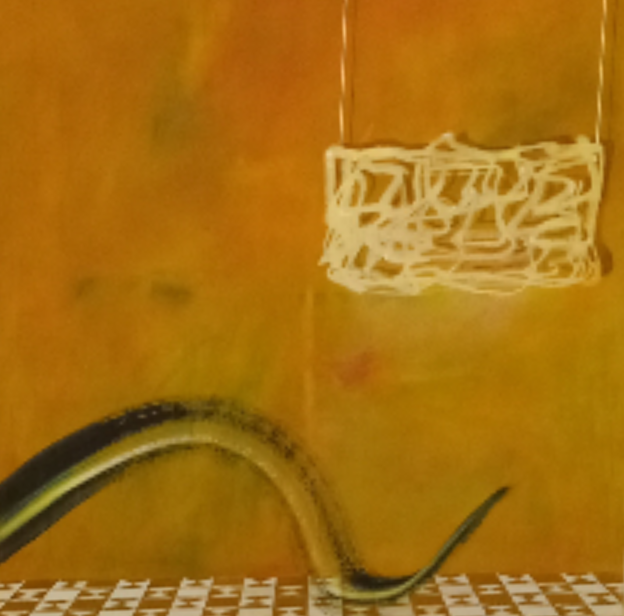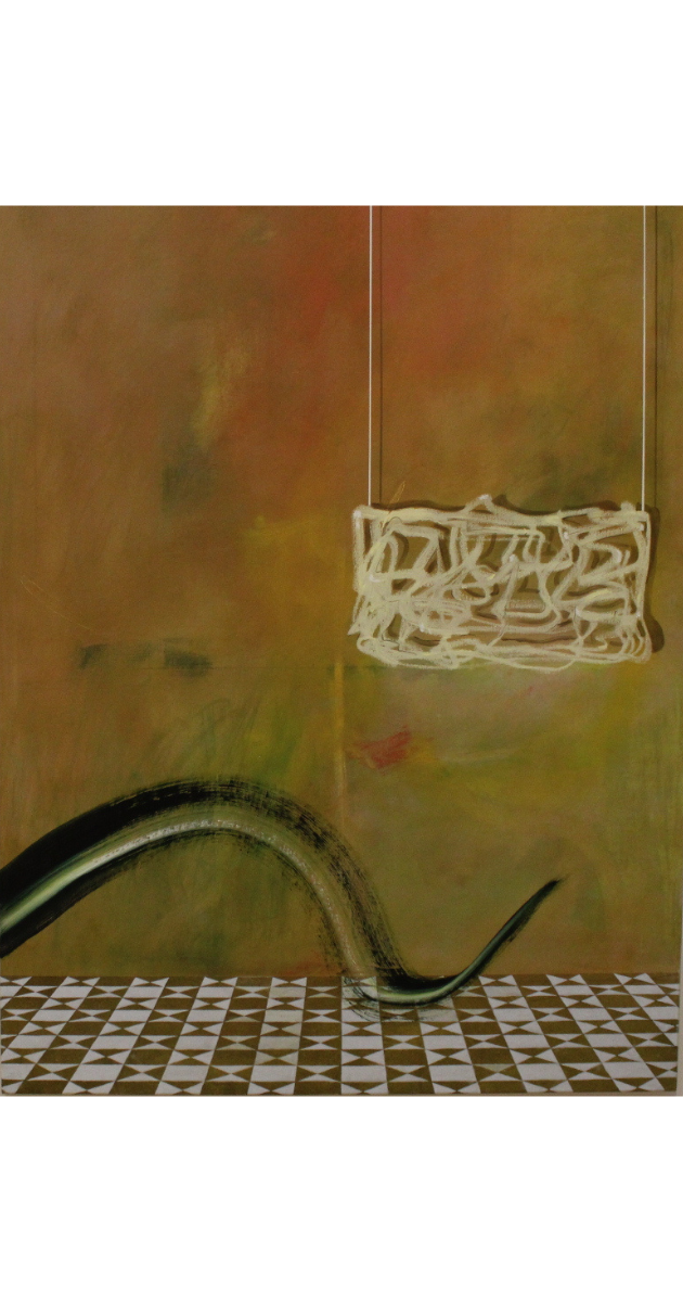 The canvas features an ochre background with an abstract golden, neon-like sign suspended above a checkerboard tablecloth pattern. A sweeping, snake-like brushstroke dominates the center, combining both representational and abstract painting styles. Fallon’s work refuses full resolution, inviting viewers to engage with its unresolved tension.