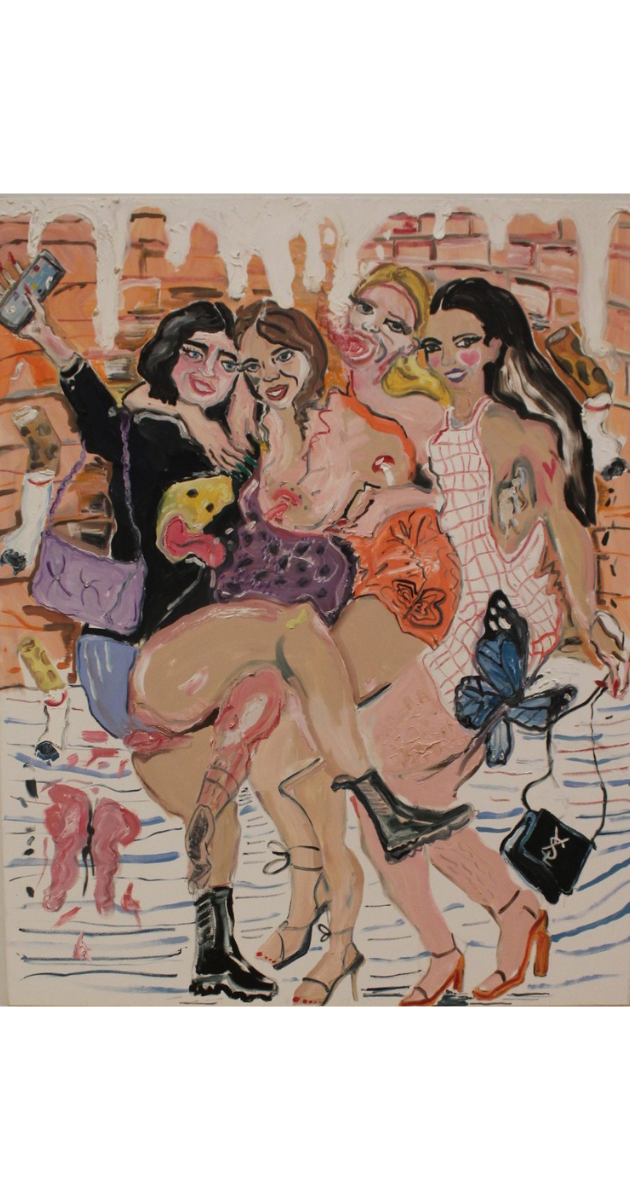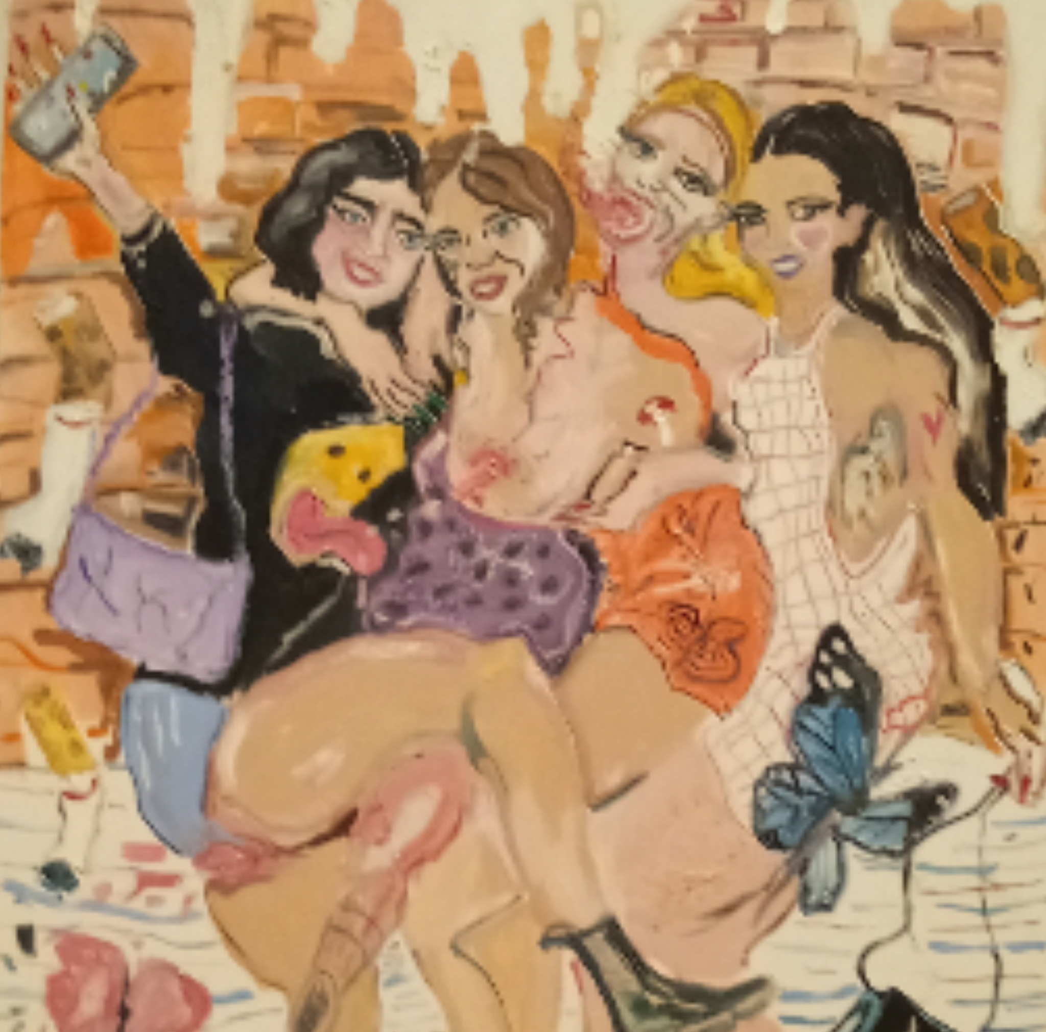 One of the most talked-about figurative works was Sheila Rennicks’ Girls Gals, a powerful and provocative portrayal of modern nightlife. Depicting a group of women during a drunken night out, the painting captures the rawness of social media culture. Scantily clad, heavily made-up, and dressed in imitation designer clothes, the women huddle for a selfie while frothing pints spill into the background. The work comments on consumerism, image, and identity in today’s society.