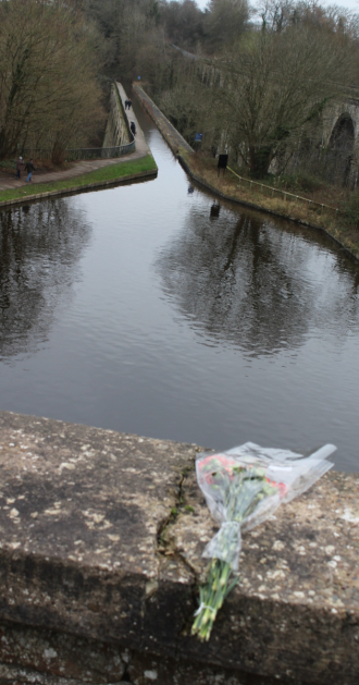 From the station, the canal towpath is easy to find, making this an accessible walk for those arriving by public transport. Before making my way down to the canal side, the sheer drop is striking. A small bunch of flowers left near the edge gave pause for thought, reminding walkers that these beautiful places also carry human stories.
