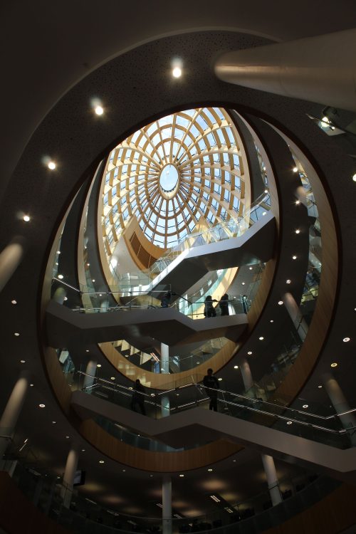 Interior of Liverpool Central Library featuring a dramatic circular atrium with a geometric skylight of wooden beams and glass panels; multi-level space with zigzagging staircases, glass railings, and visitors visible throughout the modern architectural design.