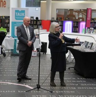 Opening event for Liverpool’s Year of Reading at Central Library, featuring the Mayor of Liverpool speaking into a microphone beside a display of books and banners including “TAUK Publishing”; the Mayor gestures mid-speech while attendees observe in a vibrant public space lined with bookshelves and signage.