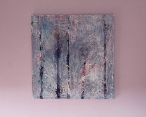 Soft lilacs, cool blues, and organic tree‑like forms emerge through layers of melted wax and acrylic, creating a textured landscape of resilience and quiet transformation.